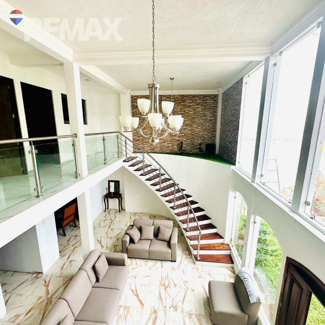 Elegante sala de doble altura con escalera en media luna.