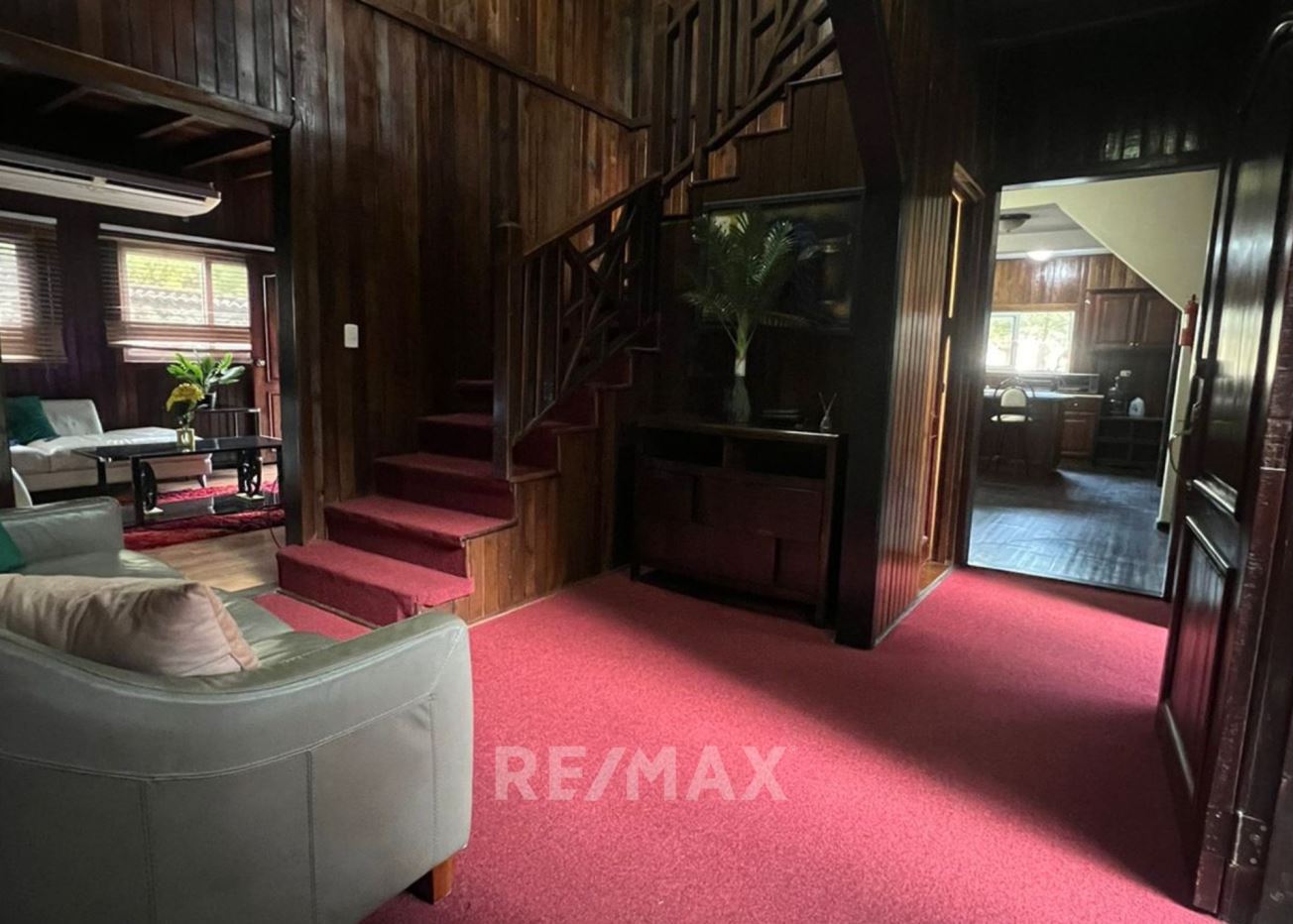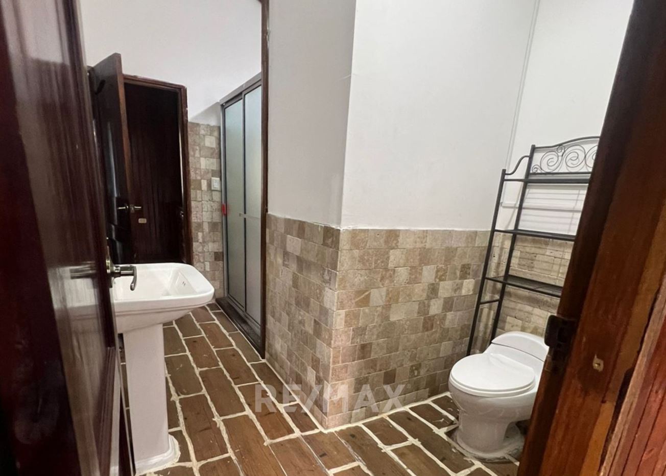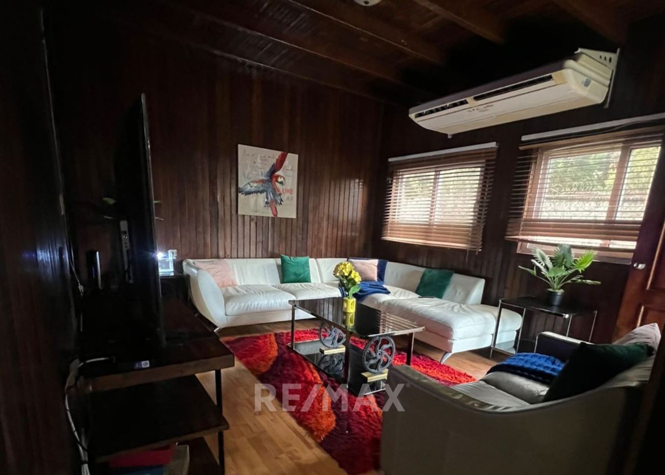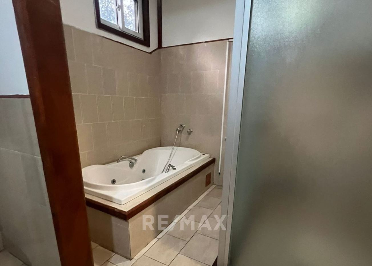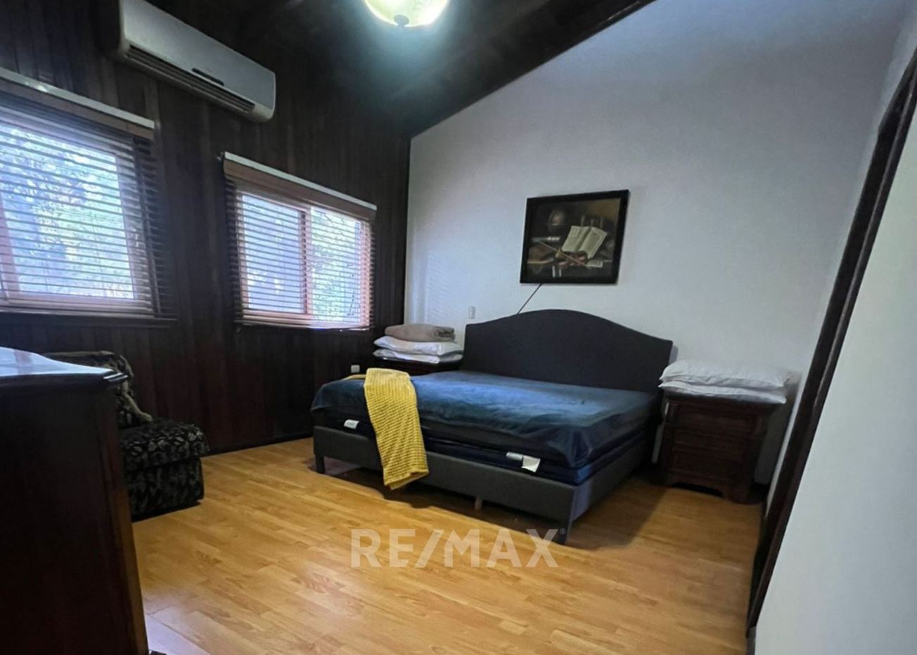 Casa con jardín frontal y posterior, baño de visitas, estudio, sala-comedor, cocina con gabinetes, área de lavandería, pérgola, 2 bodegas pequeñas, sala familiar, dormitorio principal con walk in closet, ducha, tina, bidet, churrasquera.