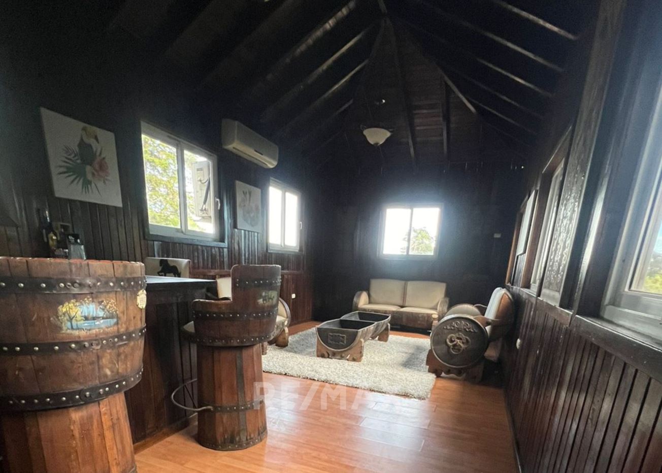 Construcción de madera. Piso de madera y laminado de madera. Puertas de madera. Techo de madera y shingle. Ventanas de PVC.