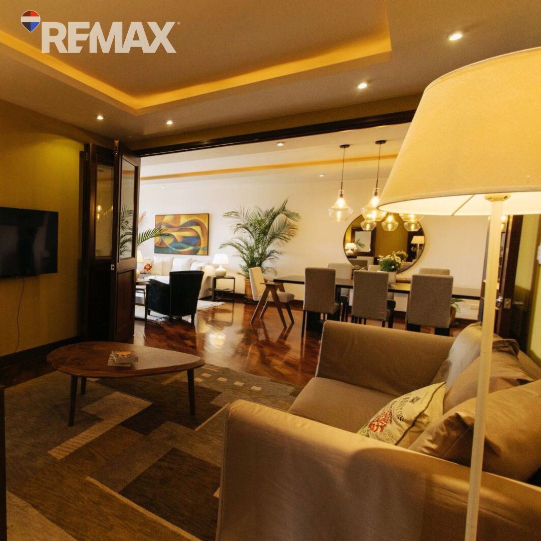 Apartamento con sala con balcón, comedor, cuarto principal con walk in closet, baño con jettina y closet de toallas, y balcón